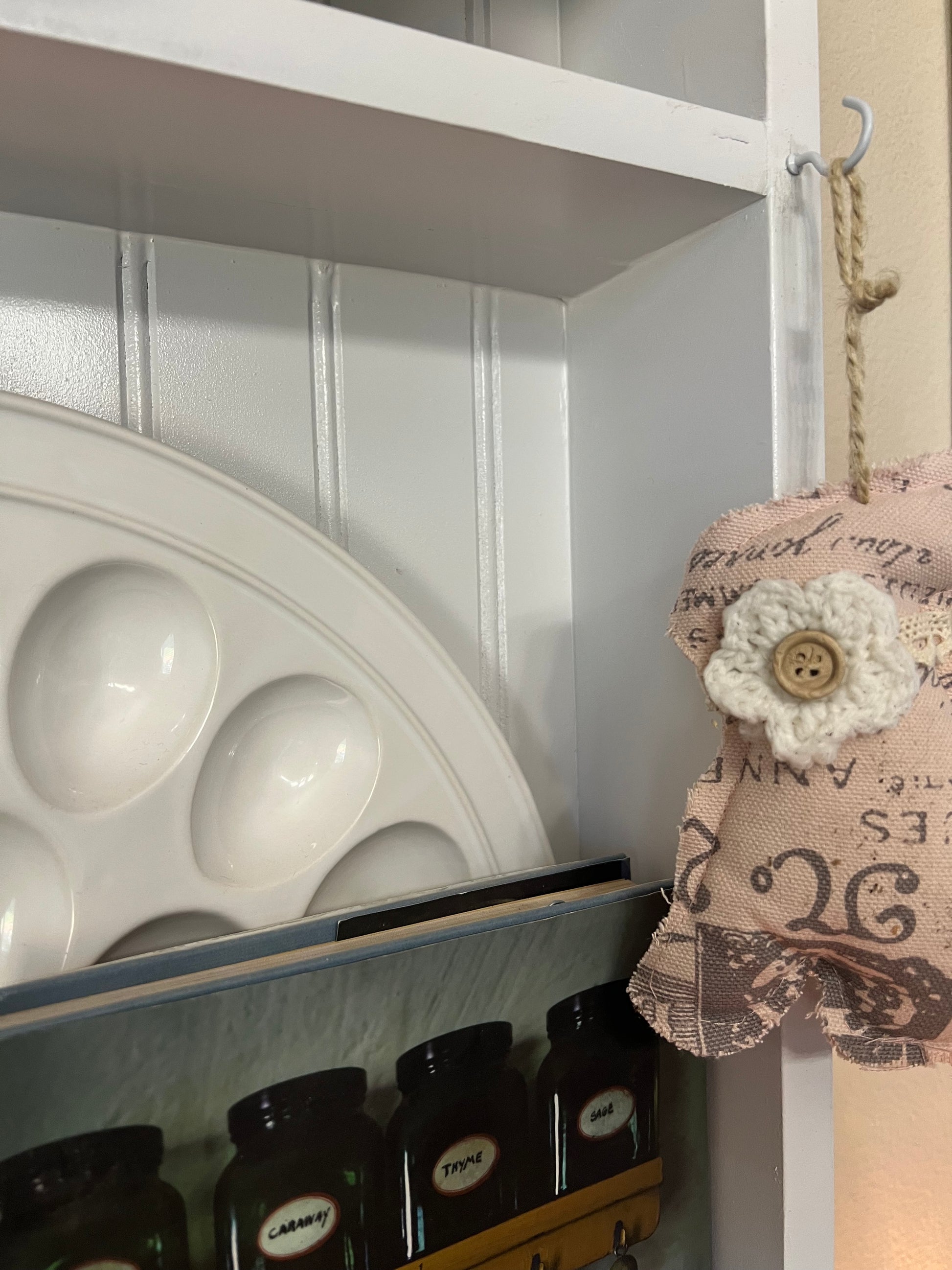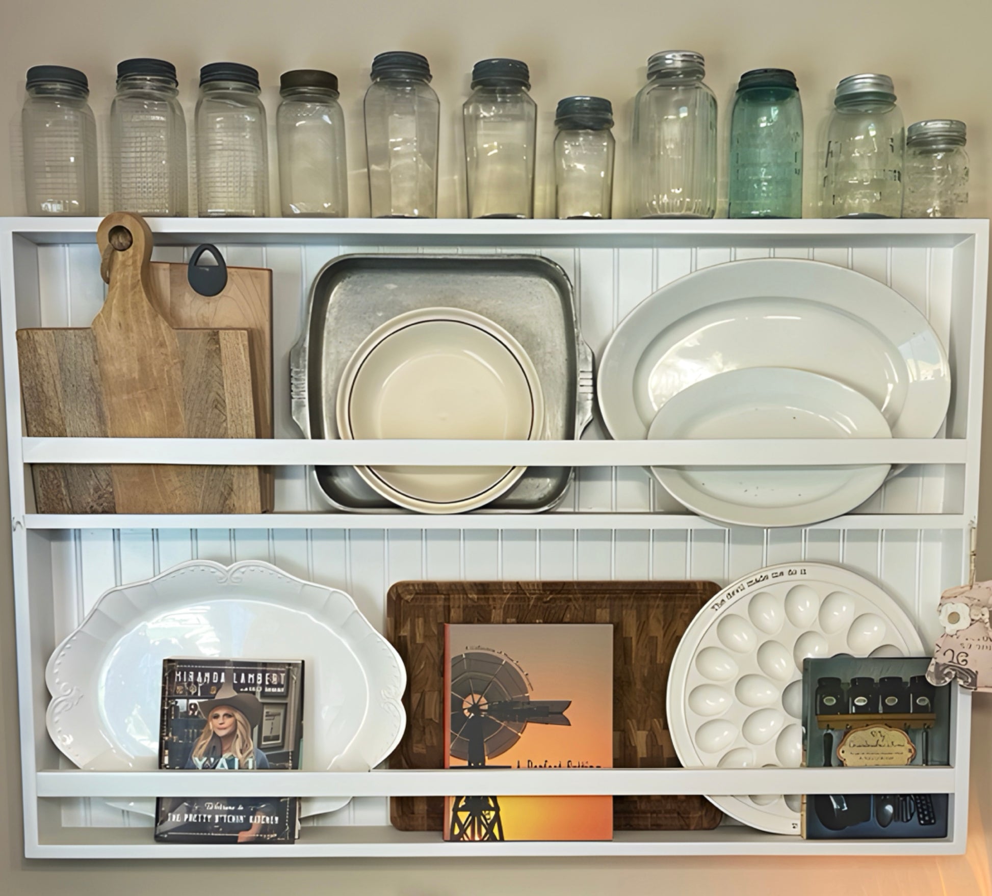 Modern Farmhouse-style plate rack. Two rows backed with white beadboard. Custom sizing available. Email your request.